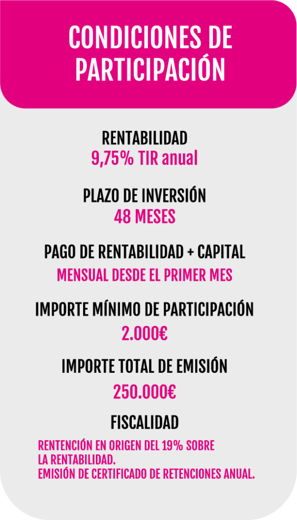 Te proponemos una rentabilidad anual fija del 9,75% sobre el dinero con el que participas. Recibirás cada mes la devolución del capital + la rentabilidad anual durante los próximos 48 meses, desde el primer mes de la firma.